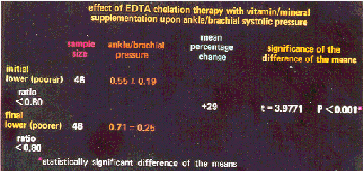 Comment: This paper looked at 117 diseased lower extremities in patients with vascular disease in the legs. The ankle/brachial systolic blood pressure index was used to evaluate the patients . In patients with a ratio less than .8 (avg. .55), there was a 29% improvement in the index to an average of .71 demonstrating improved lower extremity circulation.