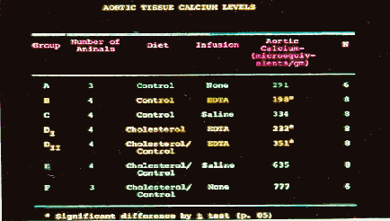 group of rabbits were sub-divided into two subgroups, the first being placed on a standard laboratory diet while the second was placed on a high cholesterol containing atherogenic diet. The animals were either infused with EDTA, saline, or nothing (in the controls) followed by sacrificing and the aortas were examined for calcium both microscopically, using calcium stains, and quantitatively. Results indicated significantly less calcium in the aortas of the EDTA infused animals when compared to both controls and saline infused animals.