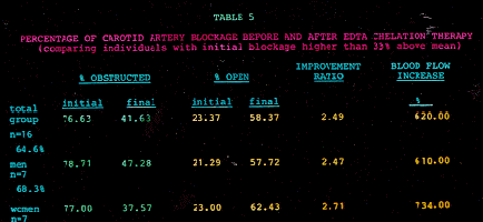 Thirty subjects with atherosclerotic vascular disease were treated with 3 gram intravenous infusions of disodium ethylene diamine tetreaacetic acid (EDTA). These patients were evaluated objectively for both right and left internal carotid atheromatous stenosis at the bifurcation, before and after EDTA chelation. Each subject had treatments over a period of approximately 10 months. Overall intra-arterial obstruction decreased 20.9 + or - 2.3% (t=8.921, p<0.001*). Subjects with greater than 33% (i.e. statistically + 1 ð) above initial mean obstruction, experienced a reduction in stenosis of 35.0 + or - 4.3% after treatment (t=8.178. p<0.001*, n=16). [*Statistically significant change comparing the difference of the means.]