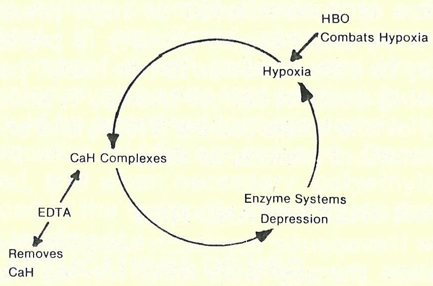 Atherosclerosis involves a build-up of calcium complexes of mucopolysaccarides, lipoproteins, elastin and collagen in the arteries. This results in the development of insoluble substrates which tend to depress a number of enzyme systems concerned with the oxygenation and energy mechanisms of the arterial wall (Fig. 1 on page 16). The end result is a state of hypoxia in the arterial wall which encourages further calcification.