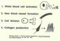 In an injury or inflammation, blood or bleeding occurs in the traumatized area. White blood cells (neutrophils, monocytes, macrophages) and platelets travel to the area. The injury releases irritants (kinins, cell membrane phospholipids) and other substances which cause activation of thewhite blood cells. They clear up the area by phagocytizing (eating) bacteria and other debris. In the process, the white blood cells and platelets release growth factors which cause three events of major importance. First, the growth factors causenew blood vessels to organize and form in the area. Second, the growth factors cause mitosis or cell division. Third, fibroblasts or healing cells become activated and lay down collagen or connective tissue. This rebuilds the traumatized inflamed area.