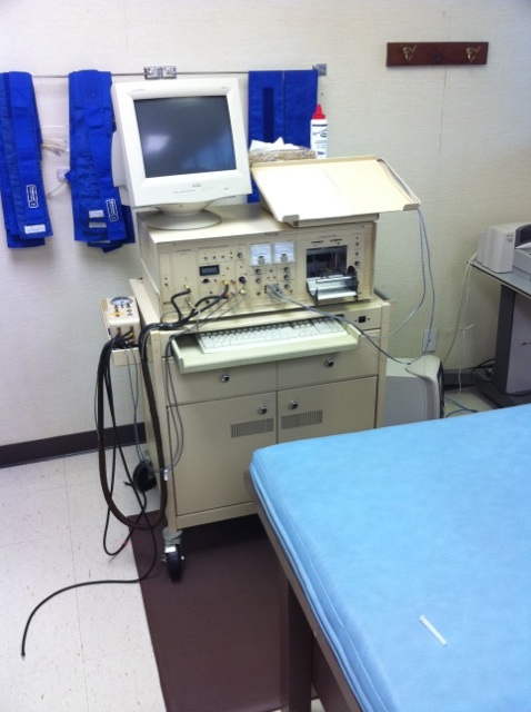 In the Lower Extremity, we do Doppler (which measures the pressure at which the artery opens) and Pletysmography (which measures the arterys pulse force at 6 areas in the leg). The adjacent photo shows a patient undergoing this procedure. We have written an article (paper # 14) on the improvement in lower extremity circulation following chelation therapy.