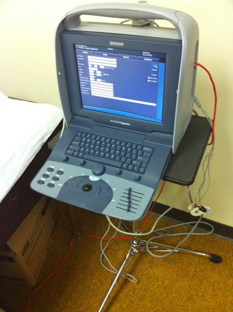 In the Doppler tests, we can estimate the velocity of blood flowing in an artery. This is useful in assessing the amount of occlusion present. Just like white water in a river, the narrower the river, the faster it flows to get the same amount of water from point A to point B. The arteries are no different. The adjacent picture is a patient getting a Doppler of the carotid arteries in the neck. We have used before and after Doppler studies to show the efficacy of chelation in blocked neck(carotid) (papers 5, 23, 27) and kidney (renal) arteries (Paper # 32).